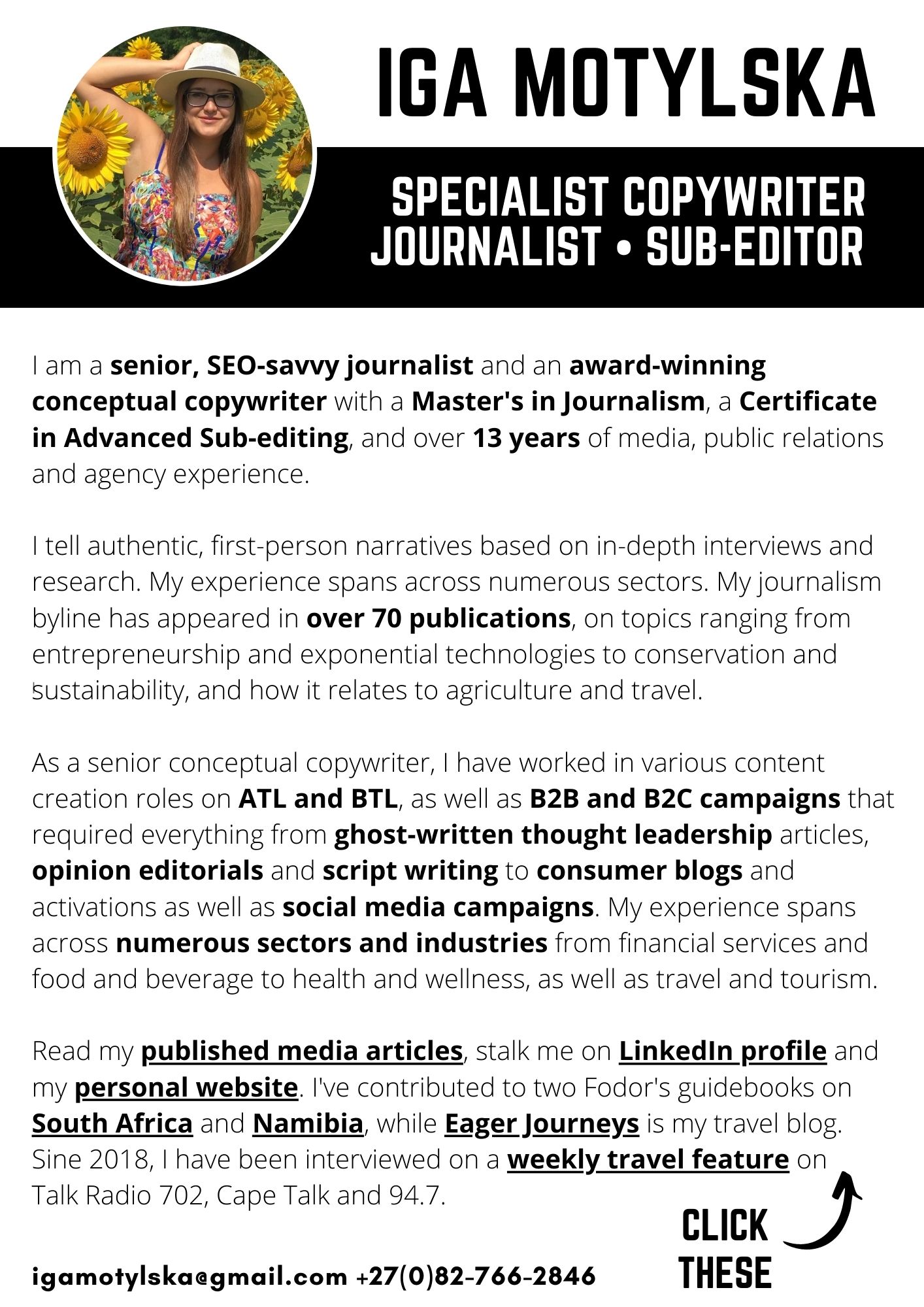I am a senior, SEO-savvy journalist and an award-winning conceptual copywriter with a Master's in Journalism, a Certificate in Advanced Sub-editing, and over 13 years of media, public relations and agency experience, across a number of industries.